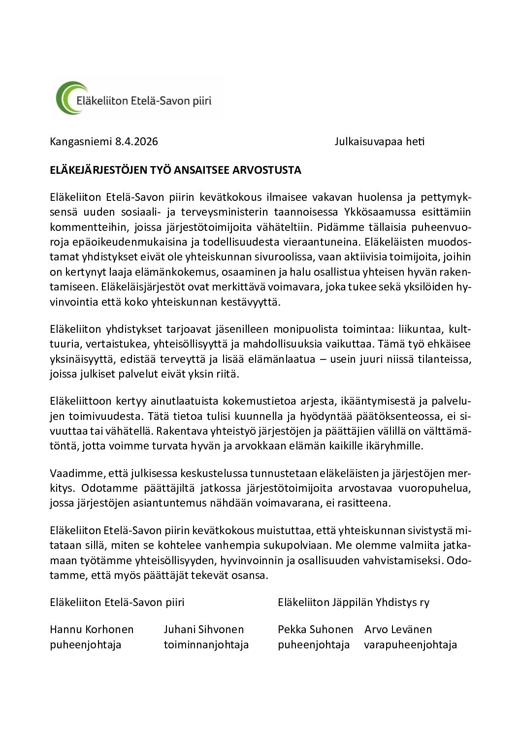 Kannanotto Kangasniemen Kevätkokouksessa 8.4.2026